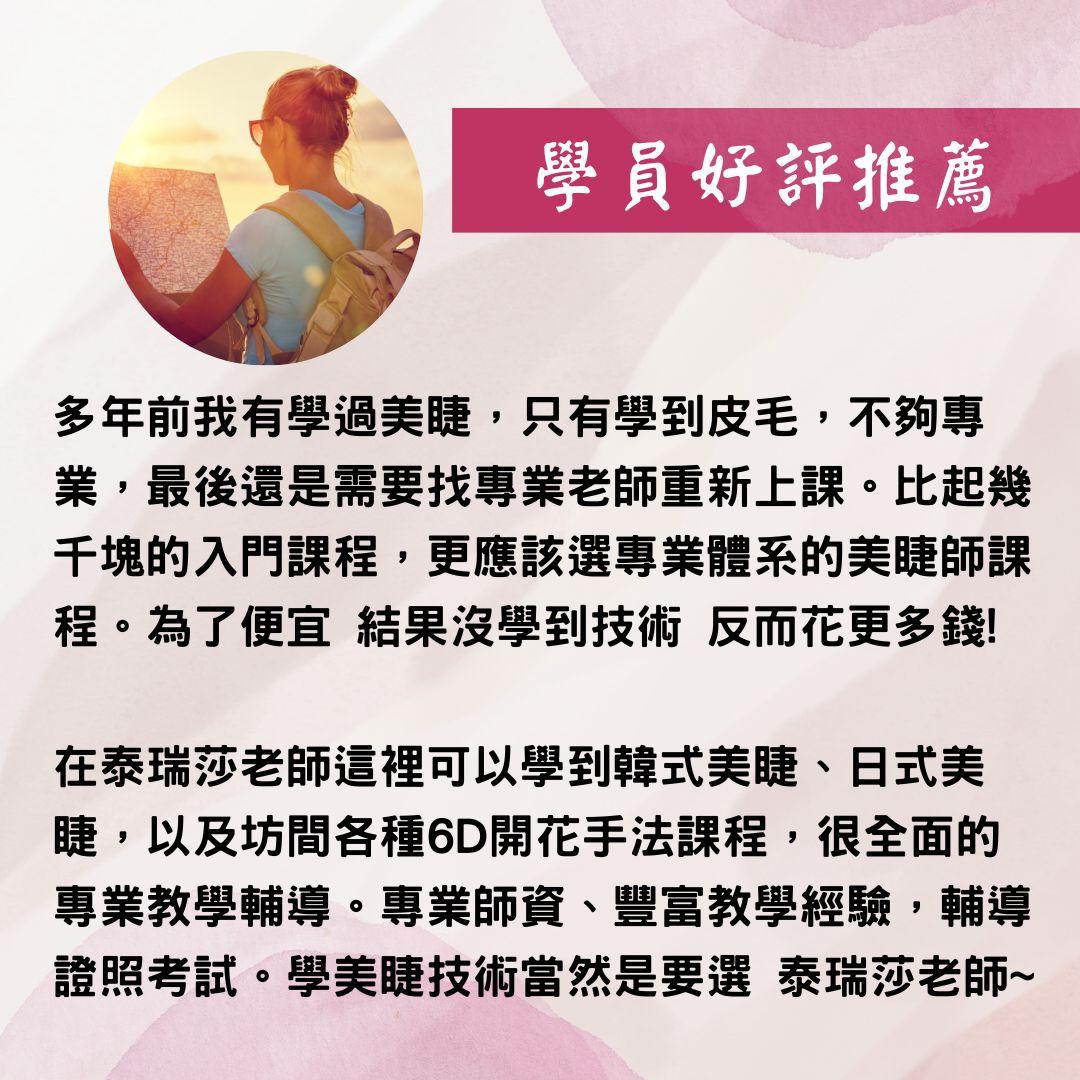 如果您想要成為專業的美睫師,快報名泰瑞莎國際美學的新竹、竹北睫毛課程就對了!這裡有專業的睫毛教學,老師的教學經驗豐富,以循序漸進的方式,讓您能夠順利上手。泰瑞莎國際美學的老師對於新竹美睫教學認真嚴謹,是有口皆碑的國際師資,至今已培訓出眾多的竹北/新竹美睫達人,泰瑞莎國際美學的課程收費實在,不會巧立名目收取額外費用,讓您能夠安心學習。